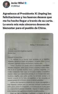Por su parte, el presidente electo argentino respondió a la misma: “Agradezco al Presidente Xi Jinping las felicitaciones y los buenos deseos que me ha hecho llegar a través de su carta. Le envío mis más sinceros deseos de bienestar para el pueblo de China”, expresó Milei con tono conciliador y publicó una imagen de la carta recibida por su par de China.