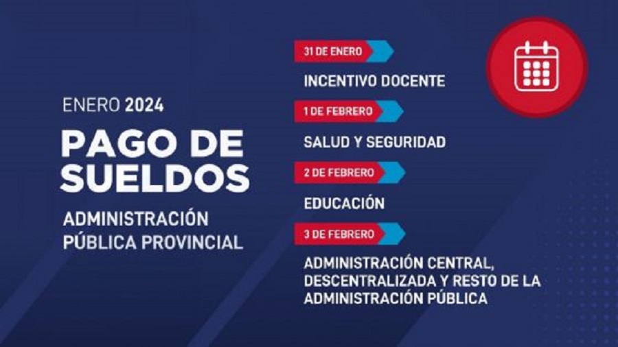 El 31 se pagará el incentivo docente, el 1 de febrero, los haberes de los sectores de Salud y Seguridad; el 2 de febrero, corresponderá al sector de Educación y el 3 para Administración Central, Descentralizada y resto de la administración pública.