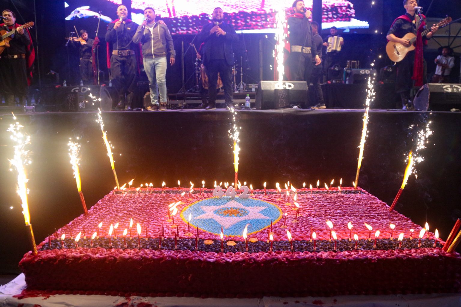 El feliz cumpleaños fue entonado por Canto del Alma y luego se repartió entre los presentes la torta gigante que elaboró la Panadería Social de la Municipalidad de Salta. Con un total de 16 planchas de bizcochuelo, rellenas de chocolate, dulce de leche y también de maracuyá, pesó 60 kilos y salieron aproximadamente 600 porciones.