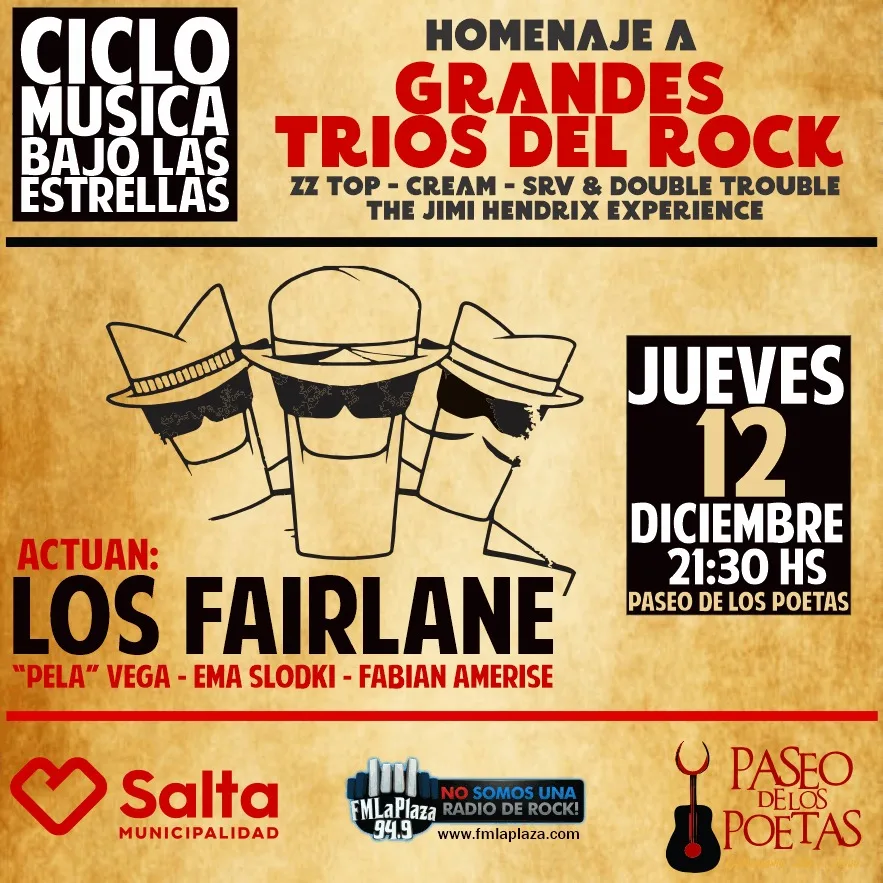 La primera fecha será este jueves 12 de diciembre a partir de las 21:30 horas, con entrada gratuita, en calle Gorriti esquina Alvarado. Consistirá en una gran velada musical con la presentación de “Los Fairane” integrado por Carlos “Pelado” Vega en bajo, Emanuel Slodki en batería y Fabián Amerise en guitarra y voz.