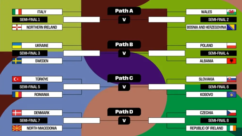 En primer orden, los 12 segundos de los grupos de la Eliminatoria de UEFA (Eslovaquia, Kosovo, Dinamarca, Ucrania, Turquía, Irlanda, Polonia, Bosnia y Herzegovina, Italia, Gales, Albania, República Checa, Macedonia del Norte, Rumania, Suecia e Irlanda del Norte) más los cuatro mejor ubicados en la Nations League 2024/2025 que no terminaron entre los dos primeros de las zonas (Rumania, Suecia, Irlanda del Norte y Macedonia del Norte) formarán las ocho llaves de semifinales que desembocarán en cuatro finales, todas series a partido único del 26 al 31 de marzo, que determinarán a los cuatro clasificados.